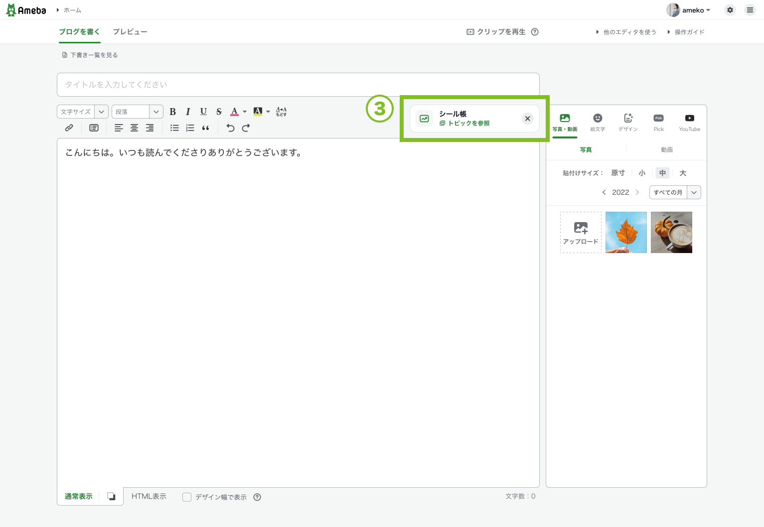 書きたいトピックをクリックでコピーして、「ブログを書く」ボタンからエディタへ移動しましょう。